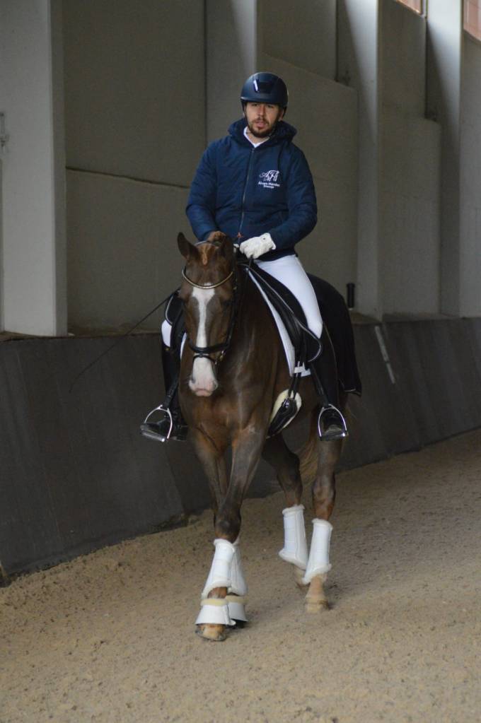 Wir entwickelten für ihn einen spezifischen Plan in Zusammenarbeit mit einem Osteopathen. Wir kombinierten Longeneinheiten mit sehr kurzen Reiteinheiten, die wir schrittweise verlängerten. Der Fokus lag ausschließlich auf der Basisarbeit: Takt, Losgelassenheit, Annahme des Gebisses, Gleichgewicht und Symmetrie auf beiden Seiten. Ergänzt wurde dies durch Elektrostimulationssitzungen nach dem Training und regelmäßige osteopathische Behandlungen.